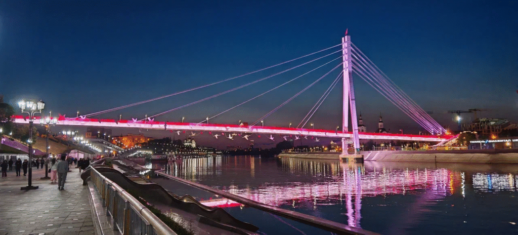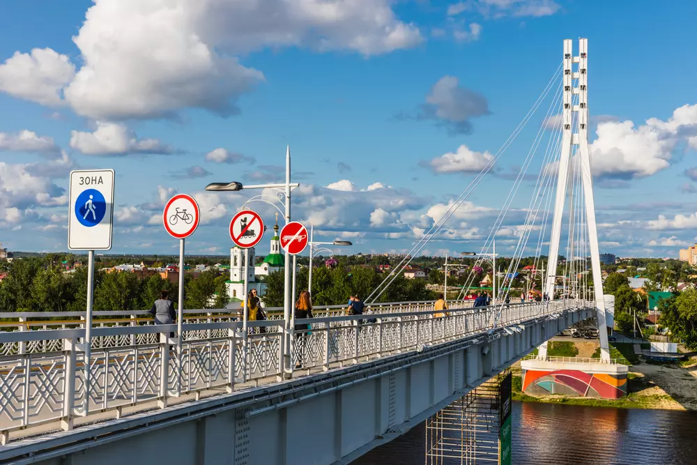 Культурно-развлекательный центр города, мост через Туру – это не только инженерное чудо, но и важное место для прогулок. С него открываются завораживающие виды на город особенно при закате. Эстетично оформленная в подсветке, эта достопримечательность является одной из самых посещаемых.